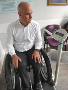Mark Pollock performing press-ups in a blue tshirt and shorts while his legs are raised over a bar.